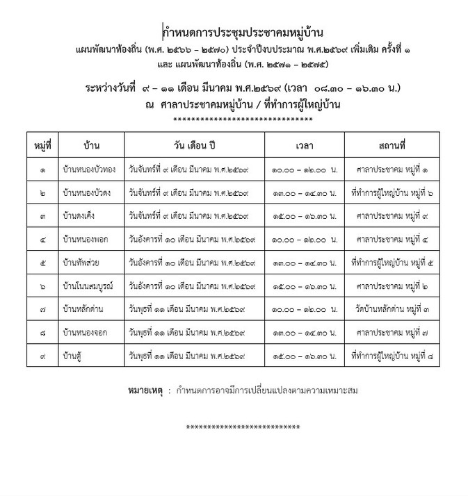 ขอเชิญเข้าร่วมประชุมประชาคมระดับหมู่บ้าน เพื่อการจัดทำแผนพัฒนาท้องถิ่น (พ.ศ.2566 - 2570) ประจำปีงบประมาณ พ.ศ.2569 เพิ่มเติม ครั้งที่ 1 และแผนพัฒนาท้องถิ่น (พ.ศ. 2571-2575)